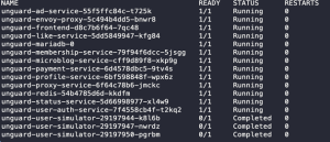Figure 3: Pod StatusThe Unguard deployment creates multiple services including payment processing, user profiles, frontend, and membership management.